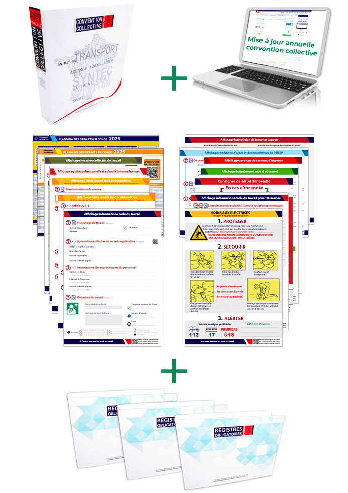 Le droit du travail prĂ©conise un certain nombre d'obligations pour les employeurs (entreprises, commerces, artisans, associations, etc.) Ă partir du premier salariĂ©. Afin de faciliter la mise en place de ces obligations, le centre national du droit du travail Ă mis en place un pack regroupant les principaux documents en matière de rĂ©glementation quelque soit votre secteur d'activitĂ©. Ce pack rĂ©pond aux obligations : d'information des salariĂ©s, de prĂ©vention des risques au travail, de la gestion de la santĂ© et sĂ©curitĂ© sur le lieu de travail.Â